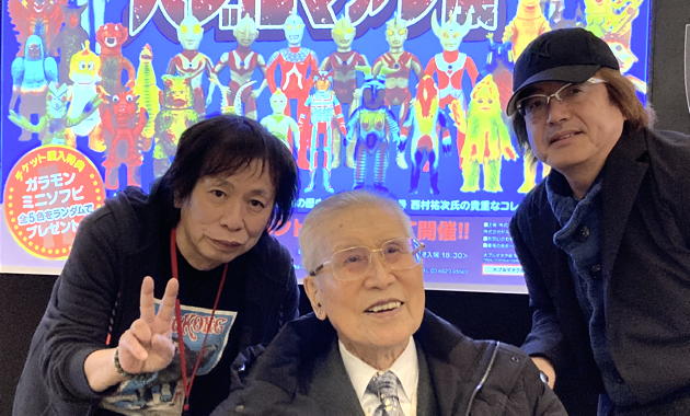 内覧会での一コマ! 怪獣ソフビを創造したいしづき三郎氏を囲む、現マルサン代表の神永英司氏とその遺伝子を世に広めるため尽力してきたM1号・西村祐次氏の豪華3ショッ