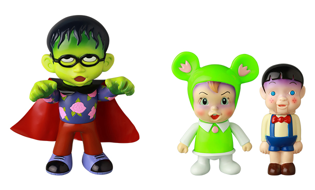 ↑浦見魔太郎 (レトロモデル) みどりVer. ↑切人 (みどりVer.) & タケシ人形 (新色) 藤子不二雄Ⓐ先生のブラック・ユーモア漫画『魔太郎が