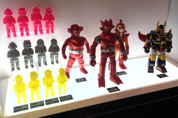 ↑左はあべ氏の会社ビッグワンクラフト製[プリケッツ]のメディコム・トイコラボ! そして右は[ダイナマイトコレクション]から『スーパーロボット レッドバロン』『スーパーロボット マッハバロン』と『小さなスーパーマン ガンバロン』。そして右は[タツノコジェネレーション]で『逆転イッパツマン』から「三冠王」だ