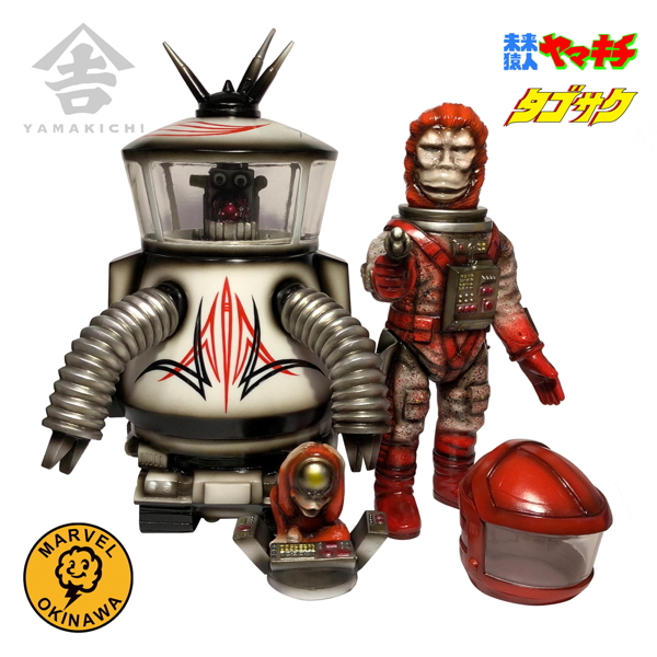 山吉屋オリジナルソフビ[未来猿人ヤマキチ]シリーズから「未来猿人ヤマキチ」と「全自動収穫ロボット タゴサク」の「山吉屋2周年記念 Marvel Okinawa Custom セット」が登場! Marvel氏の卓越したペイントワークで仕上げられた超絶クールな逸品!