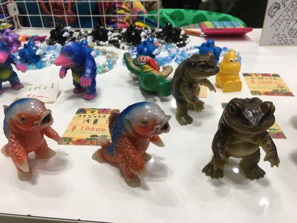 ↑よろず雑貨えびねこ屋のyasu氏の新作たち。頭部がソフビで体がぬいぐるみの「えびねこ」はその一番押し。ほかにも新作で1パーツソフビで、美味しそうな「たこねこ」や、スカルチュラとの「ウツボガエル」コラボレーション作を展示