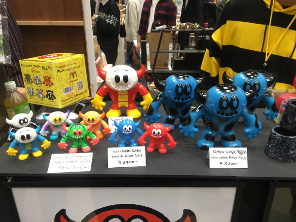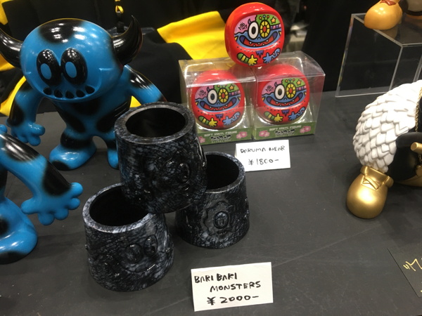 ↑怪獣芸術画家ピコピコ氏と世界のメルヘン、タケヤマ・ノリヤ氏がふたりで出店。ピコピコ氏は「コイジャラス」「ケロンが」「ボーボー」などのカスタムを展示販売。「赤羽バネ子」の生みの親として活躍中のタケヤマ氏は「赤羽愛」と印刷された別注「だるマニア」を発売