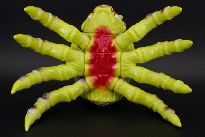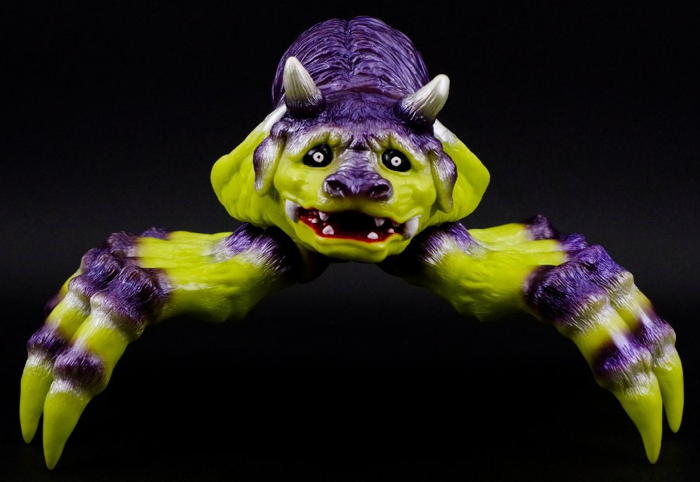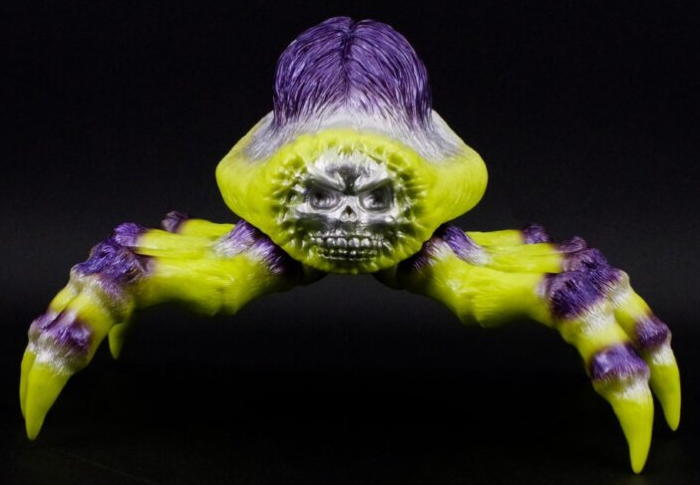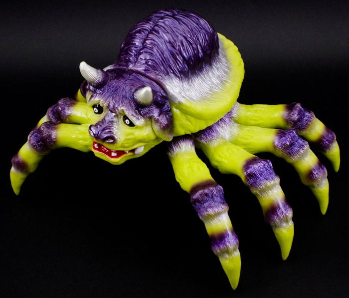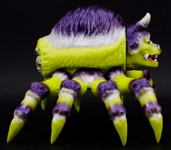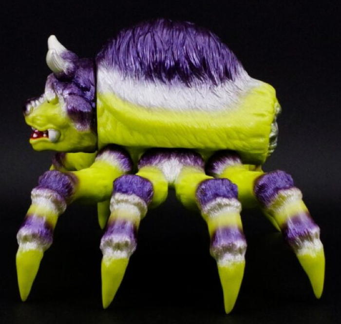 カナダを拠点に活動するNumber 2 Comboより、日本の古典妖怪を題材にして製作した「牛鬼」の新バージョンが、なんとショップ・墓場の画廊にて抽選販売される! 牛の頭に蜘蛛の胴体を持つという異形の姿を、全高約25cmという圧巻のボリュームでソフビ化。今回は黄緑色の成型色を活かしつつ、メタリックパープルを重ねた彩色で、毒々しくも力強い存在感を放つ仕上がり! 注目すべきは、こだわりがつまった造形! 全体的なリアルな作り込みや、脚部のディテールなど必見! 特に注目したいのは足の造形で、裏面を見ると部分的に可動可能な分割になっており、それがとてもソフビ的でいい! カナダから海を渡って具現化された日本の妖怪ソフビの迫力をぜひ手にしてほしい!