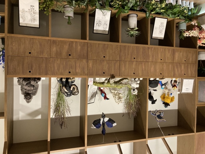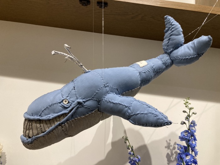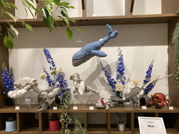 ブルーの植物と共にディスプレイされているのは「クジラ」や「カニ」などの海洋生物。古布の質感が、海の生き物の皮膚感を見事に表現していた!