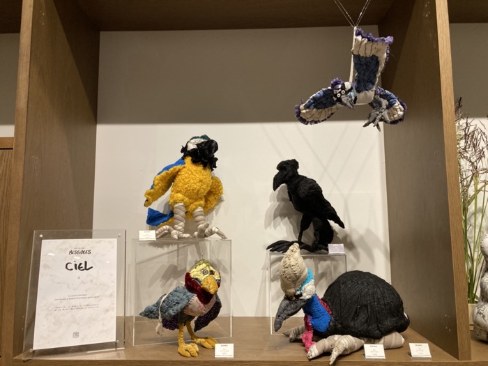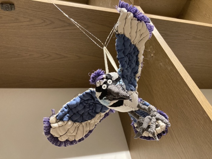 真っ黒な「カラス」は漆黒の布の光沢で羽の質感を表し、吊られた飛翔する「アオカケス」は、何層にも重なった布で翼の躍動感が表現されている。