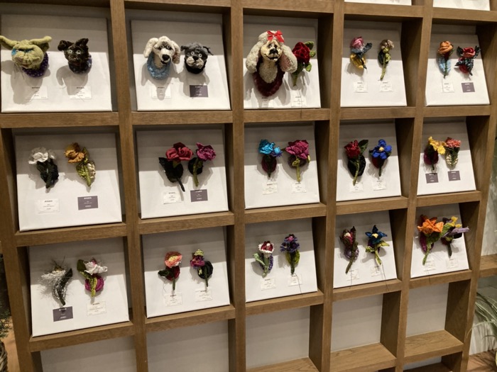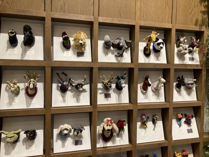 動物の頭部を模したブローチがズラリ。ひとつひとつ表情が異なり、ファッションのアクセントとしても、小さきアートとしても楽しめる。オオカミやクマなど、小さいながらも素材の組み合わせで表情豊かに作られていた