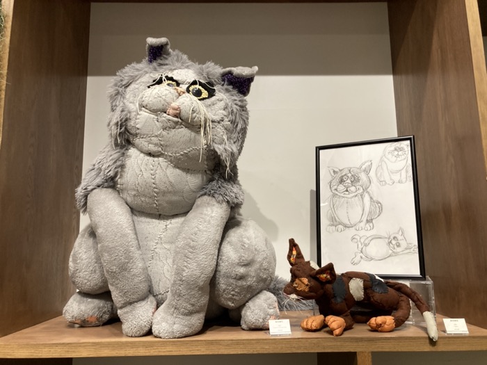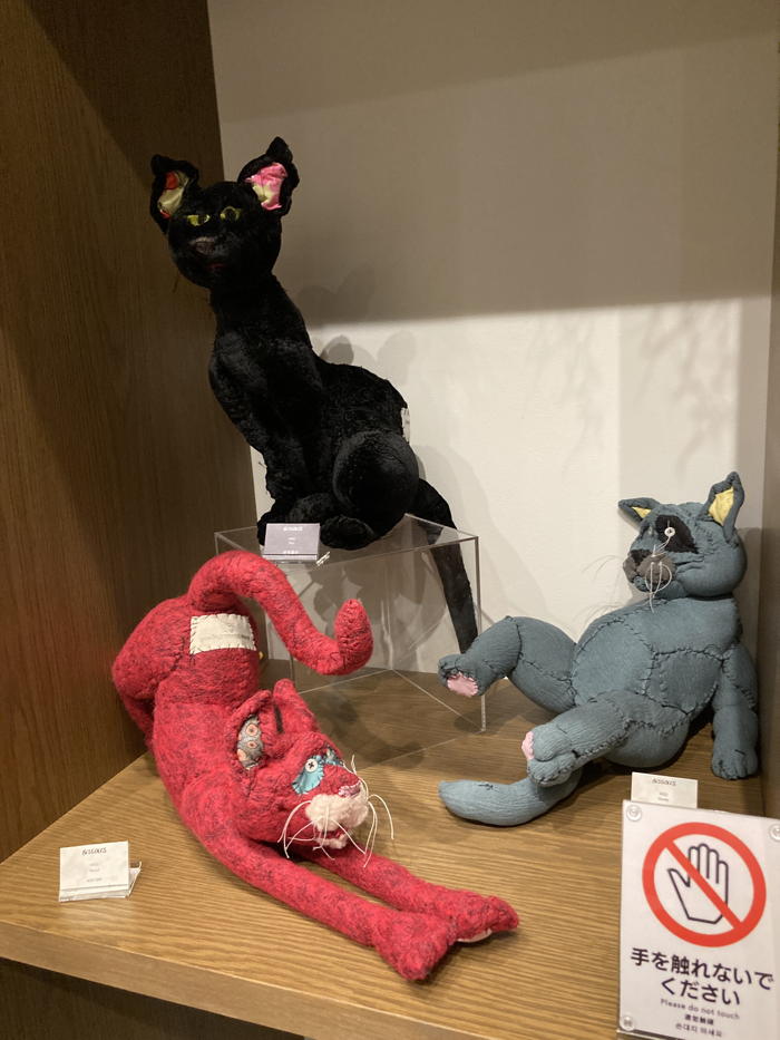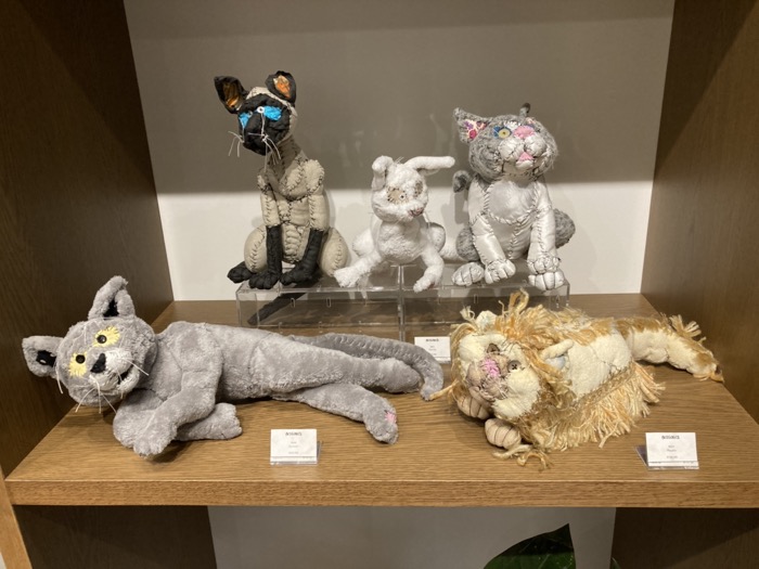 ふてぶてしくも愛らしい表情の「猫」! 首元のリボンがアクセントで、手前には小さなネズミのような作品もありました。