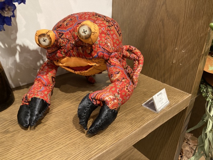 「クジラ」や鮮やかなオレンジと模様が特徴的な「カニ」の作品のアップ。「クジラ」は、まるでデニムのようなブルーの布地を使い、潮を吹いている様子も針金とビーズ等で表現。とてもかわいく仕上がっている「カニ」は、ハサミの重量感や甲羅の丸みが布で見事に再現されている。
