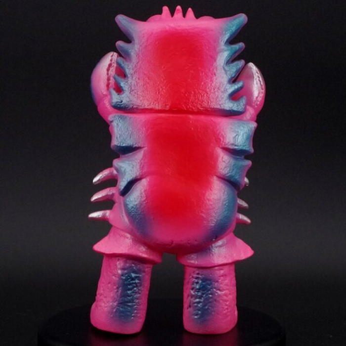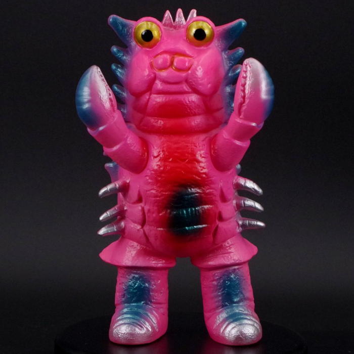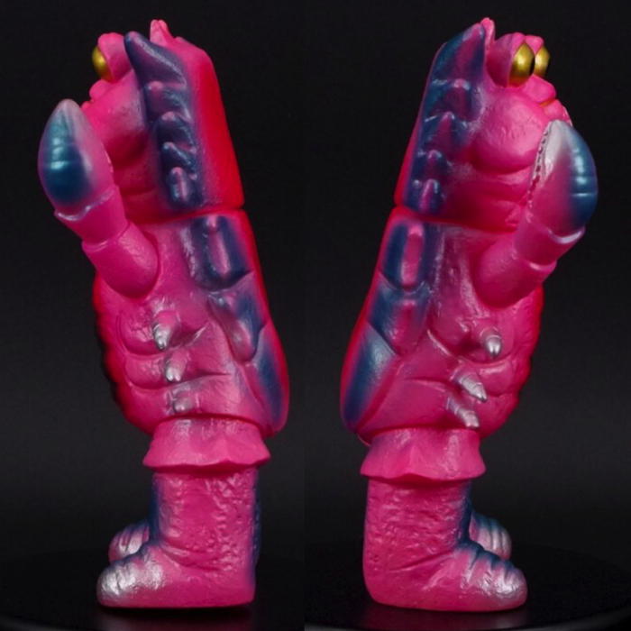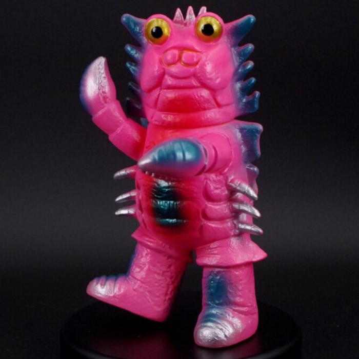 ブルマァク製『帰ってきたウルトラマン』第23話「暗黒怪獣星を吐け!」に登場した「カニ座」の怪獣「ザニカ」が、趣深い「レトロカラー」でショップ・墓場の画廊に登場! これも当時の金型が失われ長らく復刻されなかったが、新たにソフビをベースに金型を起こし直した新復刻版! 「暗黒怪獣バキューモン」に故郷を飲み込まれ、地球へと逃れてきた悲劇の怪獣! ソフビはざらざらした甲殻や両腕のハサミを細やかに造形しつつ、ブルマァク特有の温かみのあるデフォルメ造形でソフビ化。今回はピンク成型をメタリックブルーで彩った仕様で仕上げられている。先に紹介した「ビーコン」同様、本放送当時の製品に近いソフビらしいポップなカラーを楽しんでほしい!