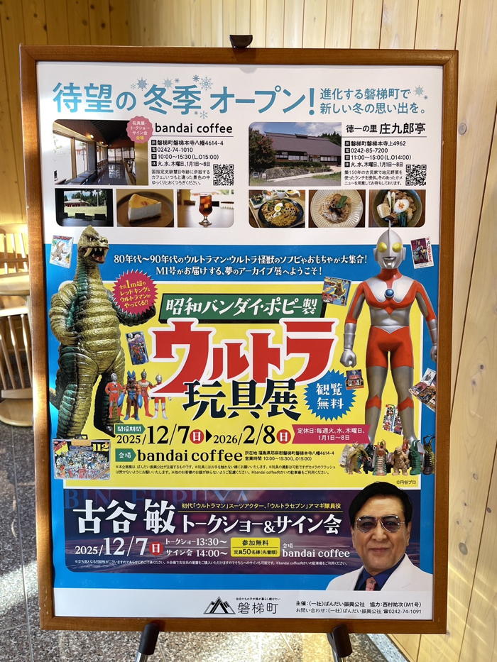 現在、福島県磐梯町のbandai coffeeで開催中の「昭和バンダイ・ポピー製 ウルトラ玩具展」が、ソフビ好きの間で大きな話題を呼んでいる。会場は、国指定史跡慧日寺跡敷地内に併設のカフェ。雪深い冬の磐梯で、なぜこれほど熱い展示が実現したのか? これは「磐梯町(ばんだいまち)」と「おもちゃのバンダイ」という、全く関係ないのに同じ名前という不思議な縁から、行政と連携する公益的民間組織であるばんだい振興公社が企画したコラボレーションなのだ! 企画担当の一般社団法人ばんだい振興公社広報室・藤田絵美氏は「字は違いますが『子どもたちに夢を与える』という点では、私たちの町づくりも同じ志を持っています。この語呂合わせをきっかけに、まずは町に興味を持ってもらえればと考えました」企画スタートを説明してくれたと。そして今回の展示について「一番の魅力は『世代を超えた会話』です。お父さん世代には懐かしくお子さんには新鮮に映る80年代〜90年代のおもちゃを通じて、家族の会話が生まれ、そんなおもちゃの熱気で、冬の磐梯町を温かく盛り上げていきたいです」と続けてくれた。そんな企画からソフビやおもちゃのコレクターとして知られる西村祐次氏(M1号)への協力を打診するのだ。