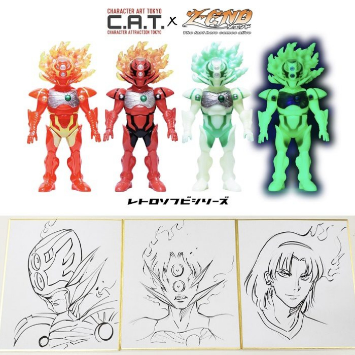 『仮面ライダーSPIRITS』連載中のマンガ家・村枝賢一先生が手がけたオリジナルヒーロー「ジエンド」のレトロソフビが注目のブランド・C.A.T.(Character.Art.Tokyo.)が2026年2月8日開催の「ワンダーフェスティバル2026[冬]」に出展! 「ジエンド」の最新バリエーションを発売する! 「多世界を渡り歩き、その度に能力を蓄積してきた強大すぎる力を持つ存在」という壮大な設定を持つ「ジエンド」。 原型師・早田将人氏による全高29cmの堂々たる造形は、レトロソフビらしい温かみとヒーローの力強さが絶妙に融合! 今回の新色「蒼焔-BLUE FLAME-」は、村枝先生がこのために新たに描き下ろしたニューデザインカラーで、鮮やかなブルーの成型色に、まるで魂が燃えているような彩色が施され、暗闇で青く発光する姿は神々しさすら感じさせる仕上がりだぞ! さらに会場では、村枝賢一先生のサイン会も開催決定! ソフビを2体購入すると、色紙にお好きなキャラクター(※『仮面ライダーSPIRITS』を除く村枝作品キャラ)を描いてもらえるという豪華すぎる内容なのだ。ソフビは新作のほか、要望の多かった「ノーマルブースト」やイベント限定の蓄光、クリアレッドなどの再販も用意され、これらには直筆サイン色紙のプレゼントや抽選会などの特典も付く! 村枝先生好きはもちろんヒーローソフビ好きも、この熱いブースは見逃せない!!