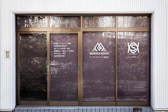 JR亀有駅からもほど近い場所にオープンするギャラリーの外観。「MAVERICK CREATE」と「SHIMA-X」のロゴがデザインされたガラス扉が目印