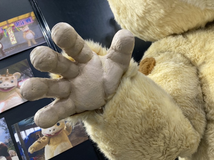 上から「カモスケ」の手はチョコレートのよう! ピンクの爪は「ブースカ」と同じまん丸 ! 撮影での活躍を物語る、爪のピンク塗料が少し剥げているリアル!