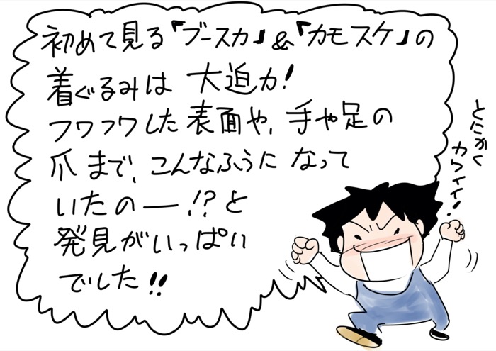 上から「口の中はこうなってた!」。下から見上げた「ブースカ」。そして「ブースカ」の手のひら! 「フカフカ度が高くて触ってみたくなる!」とエビキヨ先生。足の指と爪はまん丸! 肉球的でもあります。