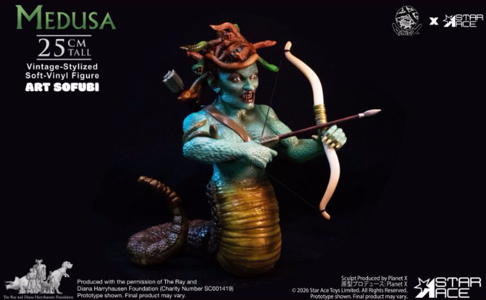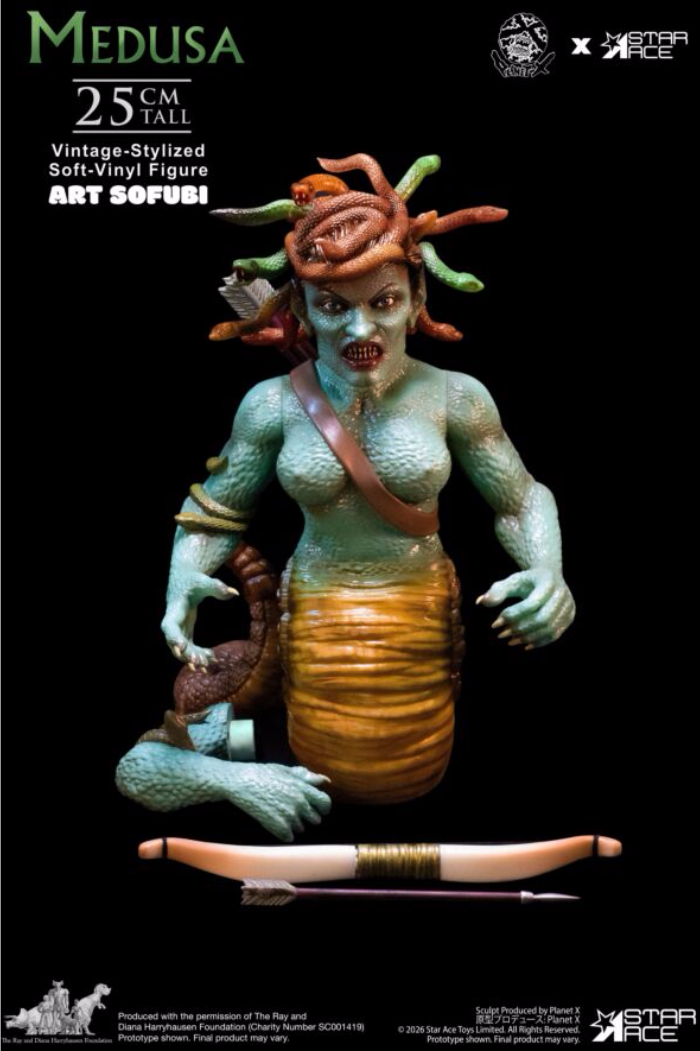 香港の人気メーカー・PLANET Xとスターエーストイズの強力タッグが贈るアートソフビシリーズに、特撮の神様レイ・ハリーハウゼンが生み出した傑作キャラクター「メデューサ」が参戦! 下半身が蛇となった特徴的なフォルムを、25cmの絶妙なサイズ感でアート性豊かに再現。髪の蛇一匹一匹のうごめきや、冷徹な表情の造形は見応え十分! アクセサリーとして弓と矢が付属し、腕パーツの差し替えで弓を構える緊迫のポーズも再現可能。ソフビならではの温かみとクリーチャー造形のシャープさが融合した、コレクター必携のアイテムとなっている!