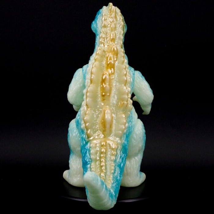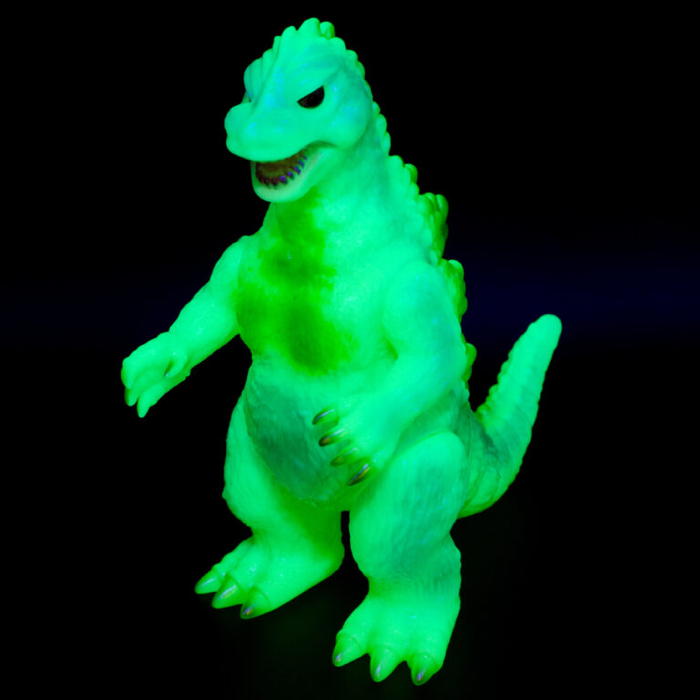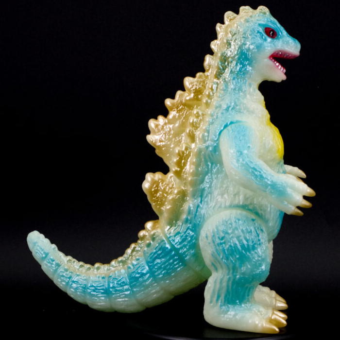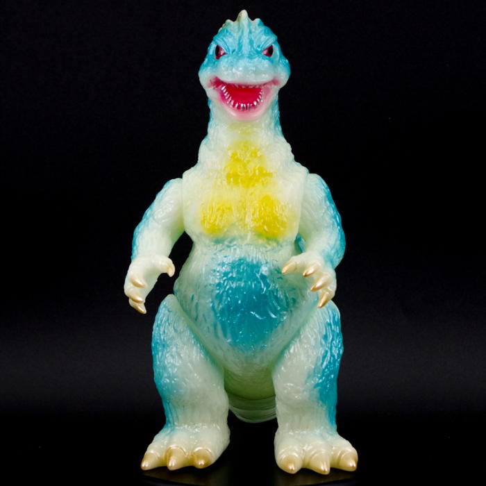 1970年代に発売されたジャイアントサイズが持つ独特のディフォルメ感を、スタンダードサイズに凝縮した人気ソフビ「ゴジラ50」。その最新作が、暗闇で発光する蓄光仕様で登場! 勇ましい表情と荒々しく刻まれた皮膚のモールド、そしてボリューム満点のドッシリとした体躯は、まさに怪獣ソフビの理想形。今回は蓄光成型の上にメタリックブルーとゴールドのスプレーを大胆に配し、力強さを強調。ディテールを際立たせながらも、素材の輝きを殺さない絶妙な彩色バランスには脱帽だ。ライトを消せば、闇に浮かび上がる怪獣王のシルエットに酔いしれること間違いなし。時代を超えて愛されるブルマァクの魂を感じる一体だ!