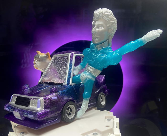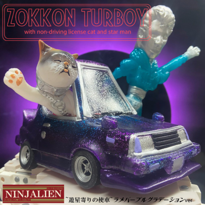 爆走する昭和レトロなフォルムがたまらない「ZOKKON TURBOY(ゾッコンターボーイ)」を展開するNINJALIENからまたまた気になる新バージョンが登場! 今回の「遊星寄りの使車~ラメパープルグラデーションver」は、宇宙の神秘を感じさせる美しいラメ成型にパープルのグラデーションが施された、まさに銀河系仕様の仕上がり! セットには、ハコ乗りポーズがキマっている「スター人形」と、愛嬌たっぷりの「ぶさかわ無免許猫」が付属。さらに猫用の「Jそんマスク」やステッカーまで付いてくる豪華仕様となっている。販売だがユニークな方法をとっていて、ショップ・アダムスキー(〒542-0076 大阪市中央区難波5-1-60難波シティ南館B1F)店内のショーケースのどこかに潜んでいる本体を発見して購入するという、遊び心あふれる“お宝探し方式”を採用しているのだ。完全手作業による製作のため、限定わずか5個という極少数販売で、実は2026年3月15日より発売中なのだが、運が良ければ、まだ店内ショーケースの中でソフビ者を待っているかも!? この「遊星」から届いたお宝を、ぜひその手で確保してほしい。