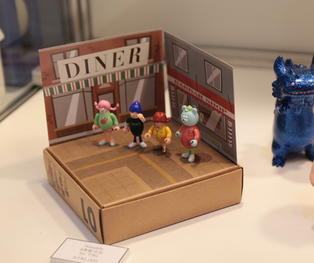 ↑T9G氏のブースには、次回「デザフェスvol42」で発売される、Monkey king “red”、RANGEASの「GID “PARADISE sunrise 10th ver”」や「Clear “PARADISE sunrise10th ver”」など。3体並ぶMonkey kingの中と右はデハラ氏の彩色。また自身がキャラクターデザインを担当したテレビ東京で放映中のCGアニメ『ナッツライフ』のフィギュアもある!