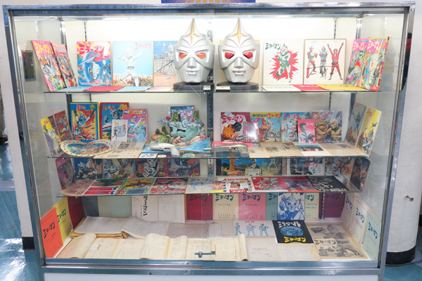 ↑西村祐次氏(M1号)による貴重な『ミラーマン』コレクションの展示。マスクや番組資料、当時発売されたおもちゃなどを展示